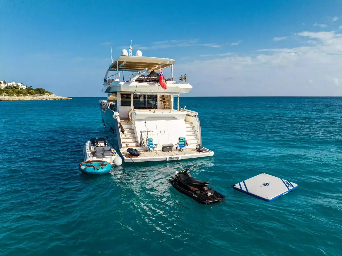 Whether on board or exploring islands there are plenty of opportunities to create unforgettable moments aboard this motor yacht. Select from an array of water toys or simply unwind and bask in the sun. The yacht also features entertainment options for day trips or cruises ensuring a celebration amidst coastlines and exotic islands.